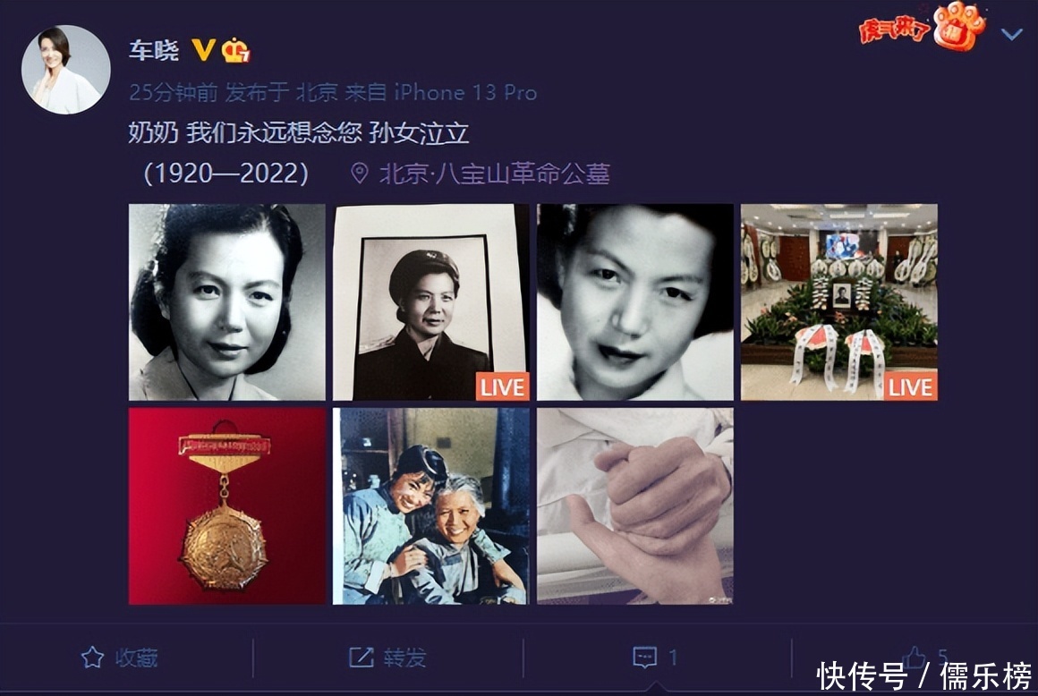 而举办完葬礼后,车晓也在社交平台发声悼念奶奶车毅,「奶奶 我们永远想念您 孙女泣立」。并且,车晓还晒出奶奶年轻时的照片,这位已经仙逝的百岁老人,不仅是抗日女战士,还是仪态大方的一代女明星,年轻时的颜值完全不输车晓,她的成就也远在儿孙之上。